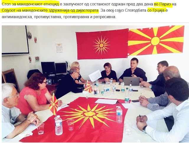 «Σταματήστε την ‘εθνοκτονία’ των Μακεδόνων», είναι το συμπέρασμα της συνάντησης που πραγματοποιήθηκε πριν από δύο ημέρες στο Παρίσι, από την Ένωση (Σλαβο) μακεδονικών Ενώσεων της Διασποράς.