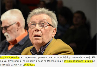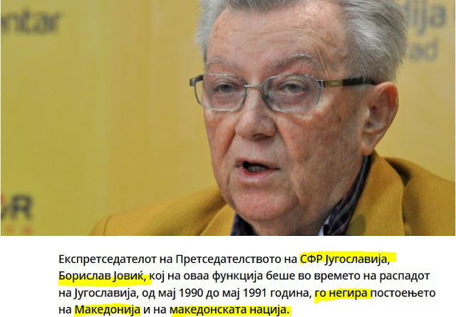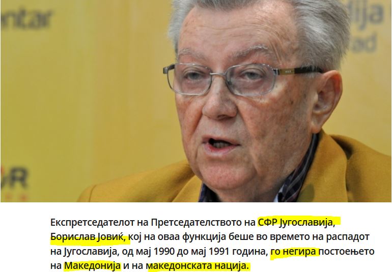 Ο πρώην πρόεδρος στην προεδρία της Σοσιαλιστικής Ομοσπονδιακής Δημοκρατίας της Γιουγκοσλαβίας, Μπόρισλαβ Γιόβιτς, ο οποίος κατείχε το αξίωμα αυτό κατά τη διάλυση της Γιουγκοσλαβίας, από τον Μάιο του 1990 ως τον Μάιο του 1991, αρνείται την ύπαρξη της Μακεδονίας και του Μακεδονικού Έθνους, γράφει το σλαβικό δημοσίευμα των Σκοπίων.