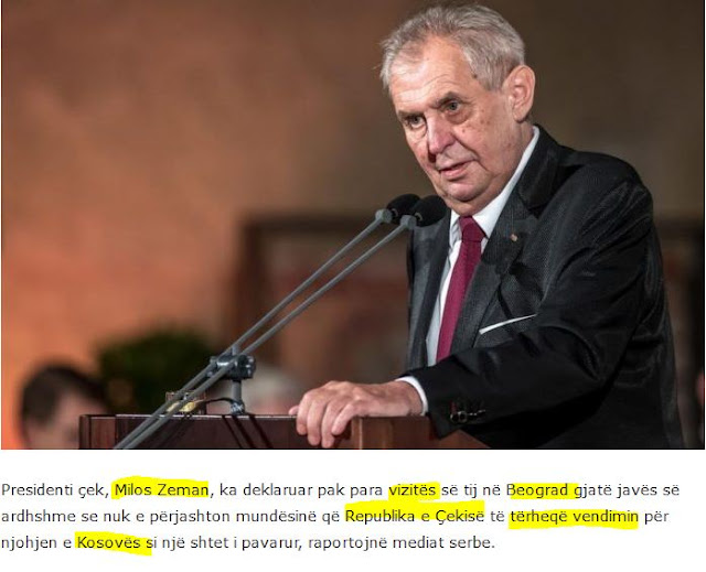 Ο πρόεδρος της Τσεχίας, Μίλος Ζέμαν, δήλωσε λίγο πριν επισκεφθεί την πρωτεύουσα της Σερβίας, Βελιγράδι, ότι την επόμενη εβδομάδα δεν αποκλείει την πιθανότητα η Τσεχική Δημοκρατία να ανακαλέσει την απόφασή της για την αναγνώριση του Κοσσυφοπεδίου ως ανεξάρτητο κράτος, όπως σημειώνουν σήμερα τα σερβικά μέσα ενημέρωσης.