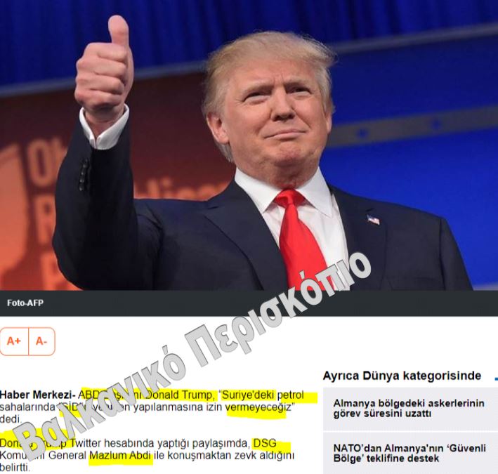 Ο Αμερικανός πρόεδρος Ντόναλντ Τραμπ έγραψε το Twitter ότι εκτιμά ό, τι έκαναν οι Κούρδοι για την καταπολέμηση του ISIS και ότι έχει έρθει η ώρα οι Κούρδοι να πάνε στις πετρελαιοπηγές της Ροτζάβα.