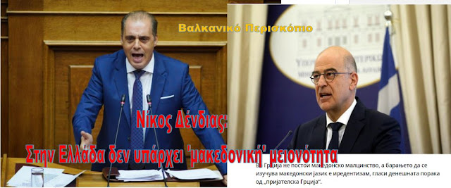 Ερωτηθείς από τον Βελόπουλο, αν ο υπουργός Εξωτερικών πιστεύει ότι «τα παραπάνω είναι το πρώτο βήμα για την ενίσχυση των προσπαθειών για την αναγνώριση μιας υποτιθέμενης μακεδονικής μειονότητας στην Ελλάδα», ο Δένδιας απαντά εν συντομία ότι «όπως είναι γνωστό, δεν υπάρχει «μακεδονική μειονότητα» στην Ελλάδα».