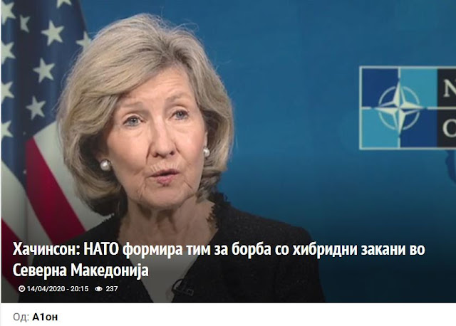 «Το ΝΑΤΟ σχηματίζει ομάδες για την καταπολέμηση υβριδικών απειλών στη Βόρεια Μακεδονία και στο Μαυροβούνιο, μετά από ψεύτικες ειδήσεις και παραπληροφόρηση καθώς η Ρωσία και η Κίνα έχουν υιοθετήσει μια σκληρή γραμμή για την κρίση της πανδημίας του κορωνοϊού στα Δυτικά Βαλκάνια», δήλωσε η πρέσβειρα των ΗΠΑ στη Συμμαχία, Κέι Μπέιλι Χάτσινσον.