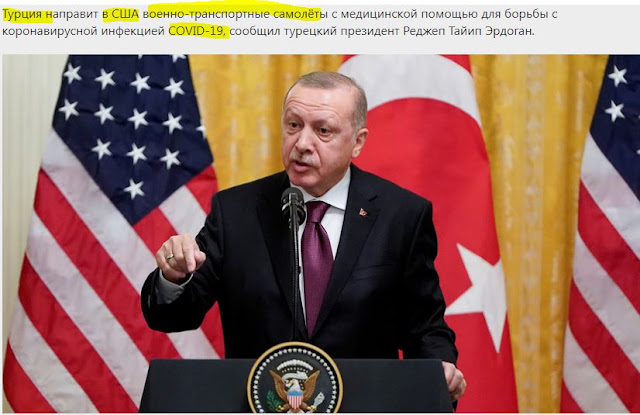 Η Τουρκία θα στείλει στρατιωτικά μεταφορικά αεροσκάφη με ιατρική βοήθεια στις Ηνωμένες Πολιτείες για την καταπολέμηση της μόλυνσης από τον κορωνοϊό COVID-19, δήλωσε ο Τούρκος πρόεδρος Ρετζέπ Ταγίπ Ερντογάν, σύμφωνα με το ρωσικό ειδησεογραφικό πρακτορείο Tass.