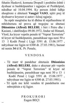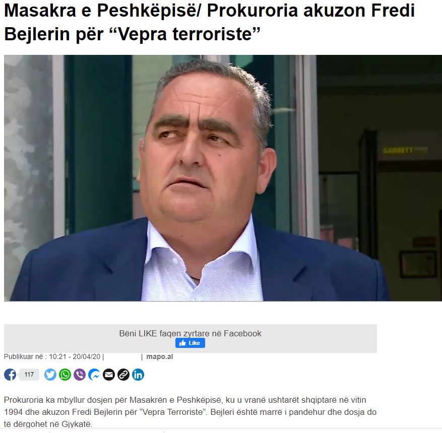 Η Εισαγγελία έκλεισε τον φάκελο της ‘Σφαγής στην Επισκοπή’, όπου σκοτώθηκαν Αλβανοί στρατιώτες το έτος 1994 και κατηγορεί τον Φρέντυ Μπελέρη για «τρομοκρατικές πράξεις». Ο Μπελέρης έχει κατηγορηθεί και ο φάκελος θα σταλεί στο δικαστήριο, γράφει αλβανικό δημοσίευμα.