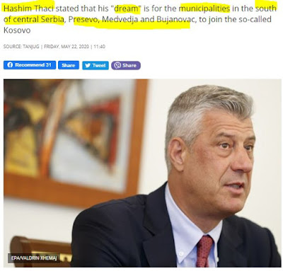 Ο πρόεδρος του Κοσσυφοπεδίου, Χασίμ Θάτσι, δήλωσε ότι το ‘όνειρό του’ είναι οι δήμοι της νότιας και κεντρικής Σερβίας, Πρέσεβο, Μέντβεντζα και Μπουγιάνοβατς να ενταχθούν στο λεγόμενο Κοσσυφοπέδιο, γράφει η σερβική b92.