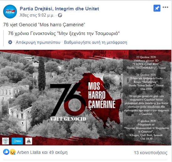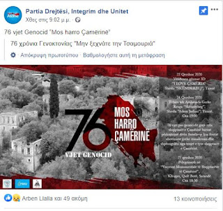 Το Κόμμα Δικαιοσύνης, Ενσωμάτωσης και Ενότητας της Αλβανίας, γνωστό ως «PDIU», διοργανώνει εκδήλωση στην κεντρική ‘πλατεία ‘Σκεντέρμπεη’ των Τιράνων /«Sheshin Skënderbej» για την 76η επέτειο της λεγόμενης «γενοκτονίας» στην περίοδο της γερμανικής κατοχής στην Ελλάδα.