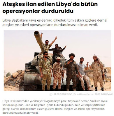 Σύμφωνα με γραπτή δήλωση της κυβέρνησης του, ο πρωθυπουργός της εθνικής συμφωνίας στην Τρίπολη της Λιβύης, Φαγιέζ αλ Σάρατζ, έδωσε εντολή (μετά τη στρατιωτική συμφωνία με Τουρκία και Κατάρ στις αρχές της εβδομάδας) να σταματήσουν οι στρατιωτικές επιχειρήσεις κατά των δυνάμεων του Χαλίφα Χαφτάρ, στις περιοχές της χώρας, όπου έχει δικαιοδοσία (όπου ελέγχει την κατάσταση).