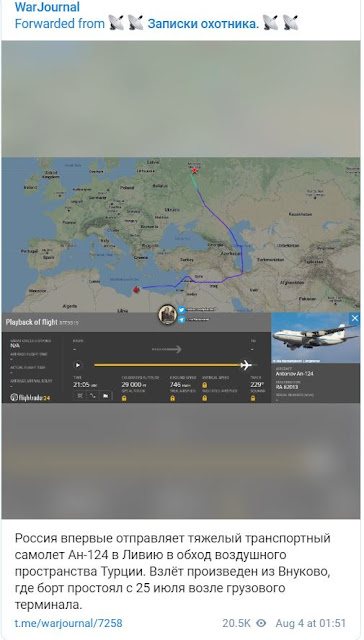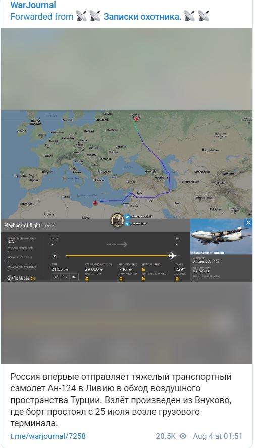 «Για πρώτη φορά, η Ρωσία στέλνει βαριά αεροσκάφη An-124 στη Λιβύη παρακάμπτοντας τον τουρκικό εναέριο χώρο. Η απογείωση έγινε από το Βνούκοβο, , αναφέρει το Telegram στο κανάλι « Записки охотника» [«Σημειώσεις του Κυνηγου»], που δημοσίευσε σχετικές φωτογραφίες και τη διαδρομή της πτήσης του αεροπλάνου.