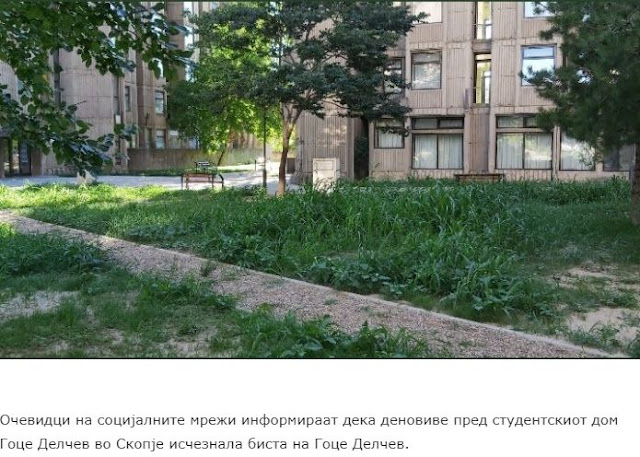 Στα κοινωνικά δίκτυα των Σκοπίων αναφέρεται η «εξαφάνιση» της προτομής του επαναστάτη Γκότσε Ντέλτσεφ που ήταν τοποθετημένη μπροστά από τη φοιτητική εστία που είχε το όνομά του.