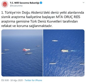 Η ανακοίνωση που έχει τον τόνο της απειλής προς την Ελλάδα, σχετικά με το ερευνητικό σκάφος Oruç Reis στην Ανατολική Μεσόγειο, έγινε στο λογαριασμό κοινωνικών μέσων του Υπουργείου Εθνικής Άμυνας, σημειώνει η τούρκικη εφημερίδα Sözcü.