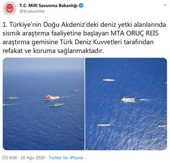 Το τουρκικό υπουργείο Άμυνας ανακοίνωσε ότι θα προστατεύσει το ερευνητικό σκάφος Ορούτς Ρέις στις σεισμικές δραστηριότητες σε περιοχές στην Ανατολική Μεσόγειο στις οποίες η Τουρκία δεν έχει δικαιοδοσία, δηλαδή, στην ελληνική υφαλοκρηπίδα.