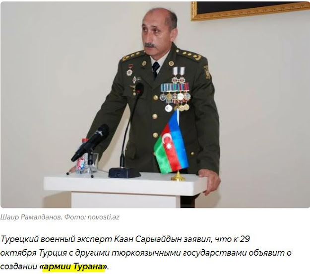 Ο Τούρκος στρατιωτικός εμπειρογνώμονας Κάαν Σαριγιαντίν δήλωσε ότι έως τις 29 Οκτωβρίου, η Τουρκία με τα άλλα τουρκόφωνα κράτη θα ανακοινώσει τη δημιουργία του «Στρατού Τουράν» (Σημ. Τουράν-= ιστορική περιοχή στην Κεντρική Ασία- μογγολικοί λαοί).