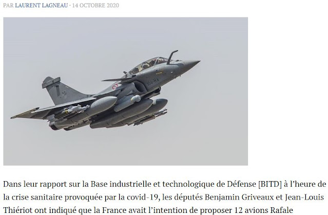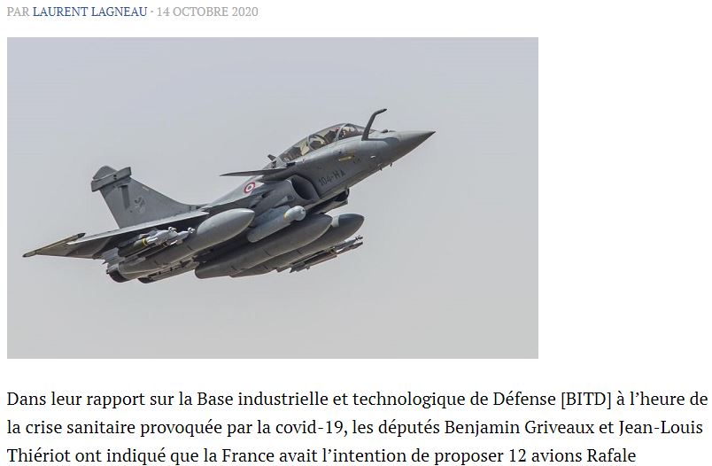 Στην έκθεσή τους για τη Βιομηχανική και Τεχνολογική Βάση Άμυνας [BITD] σε μια εποχή κρίσης στην υγεία, που προκλήθηκε από το covid-19, οι βουλευτές Benjamin Griveaux και Jean-Louis Thiériot ανέφεραν ότι η Γαλλία προτίθεται να προτείνει 12 χρησιμοποιημένα αεροσκάφη Rafale στην Κροατία, η οποία σκοπεύει να αντικαταστήσει τα MiG-Bis / UM της αεροπορικής της δύναμης, γράφει γαλλικό δημοσίευμα.