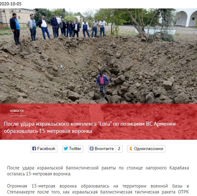 Μετά από επίθεση των Αζέρων στην πρωτεύουσα του Ναγκόρνο Καραμπάχ, Στεπανακέρτ , με το ισραηλινό πυραυλικό σύστημα ‘ Lora’ κατά θέσεων των αρμενικών ενόπλων δυνάμεων, σχηματίστηκε ένας κρατήρας 15 μέτρων.
