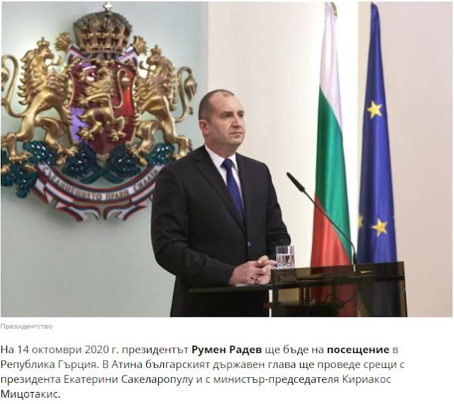 Στις 14 Οκτωβρίου 2020, ο Πρόεδρος της Βουλγαρίας, Ρούμεν Ράντεφ, έρχεται σε επίσημη επίσκεψη στην Ελληνική Δημοκρατία.