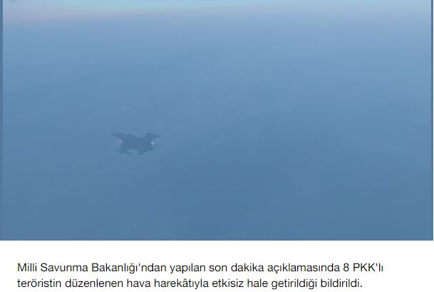 Το υπουργείο Άμυνας της Τουρκίας ανακοίνωσε σήμερα ότι σε αεροπορική επιδρομή στην κουρδική περιοχή Γκάρα του βόρειου Ιράκ σκότωσε οκτώ Κούρδους αυτονομιστές του Κουρδικού Εργατικού Κόμματος.