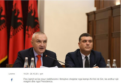 Μετά την είδηση ότι έχει ξεκινήσει ο επαναπατρισμός των παιδιών στην Αλβανία από το στρατόπεδο Αλ Χολ της Συρίας, ο εκπρόσωπος του Προέδρου Ιλίρ Μέτα ευχαριστεί την Ερυθρά Ημισέληνο της Συρίας, προσθέτοντας ότι τώρα πρέπει να αρχίσει η επιστροφή όλων των Αλβανίδων και των παιδιών τους από το στρατόπεδο!
