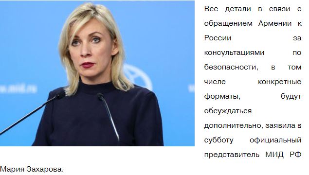 Η εκπρόσωπος του υπουργείου Εξωτερικών της Ρωσίας, Μαρία Ζαχάροβα διευκρίνισε σχετικά με τη θέση της Ρωσίας ως προς την έκκληση της Αρμενίας.