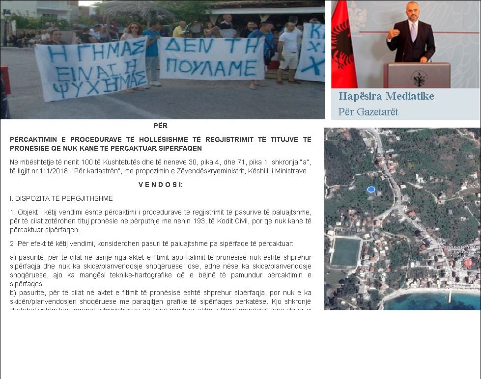 "Διεγείρονται" Αλβανοί ολιγάρχες που έχουν κατασκευάσει για κερδοσκοπικούς σκοπούς εγκαταστάσεις σε τουριστικές περιοχές ή έχουν νοικιάσει κρατικά κτίρια, αλλά που δεν κατέχουν τη γη, καθώς η γη ανήκει στην ελληνική κοινότητα .. γίνετε ιδιοκτήτες με έγγραφα από το Αλβανικό Αρχείο.
