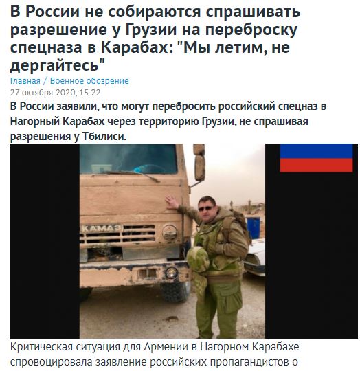 Η κρίσιμη κατάσταση για την Αρμενία στο Ναγκόρνο-Καραμπάχ προκάλεσε δηλώσεις Ρώσων προπαγανδιστών σχετικά με την ανάγκη επείγουσας μεταφοράς ρωσικών ειδικών δυνάμεων από τη Γεωργία σε ολόκληρη την επικράτεια του Ναγκόρνο-Καραμπάχ, χωρίς να ζητηθεί επίσημη άδεια από τη Γεωργία.