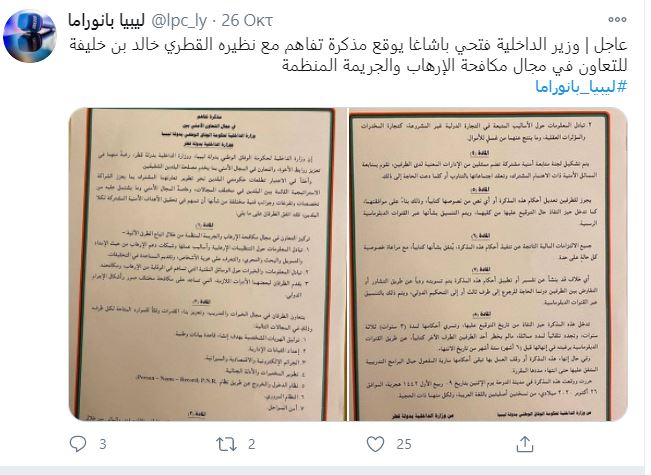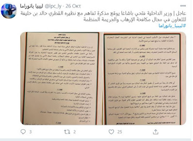 «Επείγον. Ο υπουργός Εσωτερικών Φαθί Μπασάγκα υπογράφει μνημόνιο συμφωνίας με τον ομόλογό του από το Κατάρ, Χαλίντ Μπιν Χαλίφα για συνεργασία στον τομέα της καταπολέμησης της τρομοκρατίας και του οργανωμένου εγκλήματος», γράφει το Πανόραμα της Λιβύης- ليبيا بانوراما