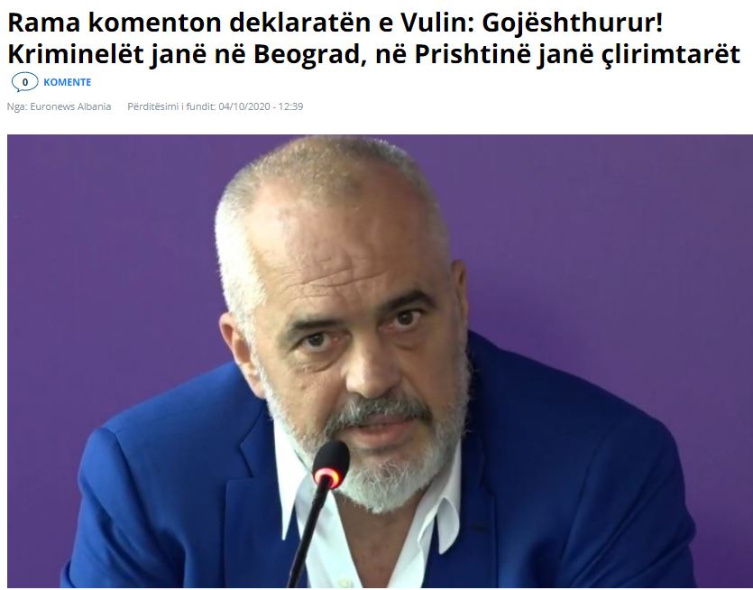 Έντονη ήταν η αντίδραση του πρωθυπουργού της Αλβανίας, Έντι Ράμα, στα σχόλια του Σέρβου υπουργού Άμυνας, Αλεξάνταρ Βουλίν για τις δηλώσεις του Ράμα ότι το λιμάνι του Δυρραχίου θα γίνει «de facto» λιμάνι του Κοσσυφοπεδίου και ότι δουλεύει για τη δημιουργία της «Μεγάλης Αλβανίας».