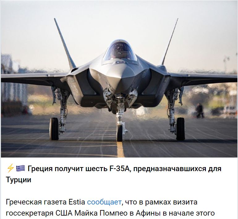 Ρώσοι σχολιαστές στο Telegram (φωτό) αναφέρουν ότι στη διάρκεια της πρόσφατης επίσκεψης του υπουργού Εξωτερικών των ΗΠΑ, Μάικ Πομπέο στην Αθήνα, συζητήθηκε το θέμα της προμήθειας μαχητικών αεροσκαφών 5ης γενιάς F-35 Lightning II της Lockheed Martin.