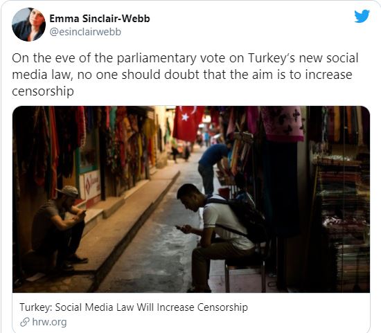 “Η νέα νομοθεσία αναγκάζει εταιρείες όπως το Twitter και το Facebook να συμμορφωθούν με τα αιτήματα της Τουρκίας να λογοκρίνουν διαδικτυακό περιεχόμενο τους εάν θέλουν να αποφύγουν τη μείωση του εύρους ζώνης και να καταστούν άχρηστα. Προτρέπουμε την Τουρκία να καταργήσει χωρίς καθυστέρηση τον νέο νόμο για να τηρήσει την υποχρέωσή της σύμφωνα με τους δικούς της νόμους και βάσει του διεθνούς δικαίου να διατηρήσει το δικαίωμα στην ελευθερία έκφρασης», σημειώνει το Παρατηρητήριο Ανθρωπίνων Δικαιωμάτων.
