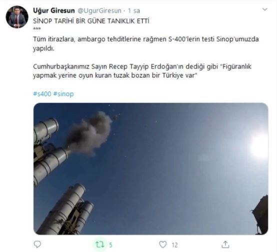 Το βίντεο δημοσίευσε ο πρόεδρος της τοπικής οργάνωσης του κυβερνώντος κόμματος AKP της Σινώπης, ο Uğur Giresun, στο Twitter, σημειώνοντας ότι «παρά τις αντιρρήσεις και τις απειλές για εμπάργκο, τα S-400 δοκιμάστηκαν στη Σινώπη μας», όπως σημειώνει η Γενί Ακίτ.