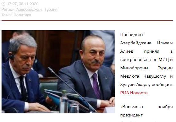 «Στις 8 Νοεμβρίου, ο Πρόεδρος της Δημοκρατίας του Αζερμπαϊτζάν Ιλχάμ Αλίγιεφ δέχθηκε τους Υπουργούς Εξωτερικών και Εθνικής Άμυνας της Τουρκίας Μεβλούτ Τσαβούσογλου και Χουλουσί Ακάρ», πληροφόρησε η υπηρεσία Τύπου του Προέδρου του Αζερμπαϊτζάν.