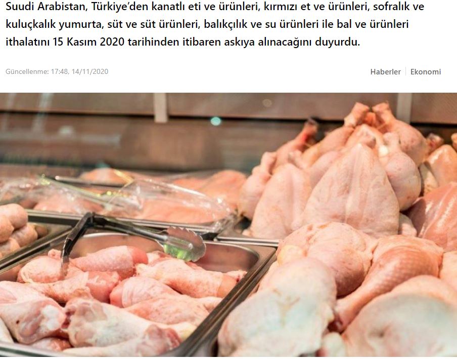 Σύμφωνα με την Sözcü ο Τούρκος εμπορικός σύμβουλος στο Ριάντ ενημέρωσε το τουρκικό υπουργείο Εμπορίου ότι η Σαουδική Αραβία σταματά τις εισαγωγές βόειου κρέατος και προϊόντα από την Τουρκία, πρόβειο κρέας και προϊόντα, κρέας και προϊόντα πουλερικών, προϊόντα αλιευμάτων και υδατοκαλλιέργειας, τρόφιμα εναλλακτικά του γάλακτος και του μητρικού γάλακτος, αυγά και τα προϊόντα με μέλι και άλλα ζωικά προϊόντα.