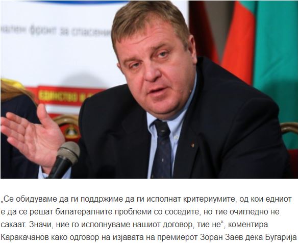 «Προσπαθούμε να τους υποστηρίξουμε να πληρούν τα κριτήρια, ένα από τα οποία είναι η επίλυση διμερών ζητημάτων με τους γείτονες, αλλά προφανώς, δεν το θέλουν. Έτσι εκπληρώνουμε τη συμφωνία μας, αυτοί όχι», σχολίασε ο Καρακατσάνοφ σε απάντηση σε δήλωση του πρωθυπουργού Ζόραν Ζάεφ ότι η Βουλγαρία παραβίασε το άρθρο 2 της Συμφωνίας Καλής Γειτονίας.