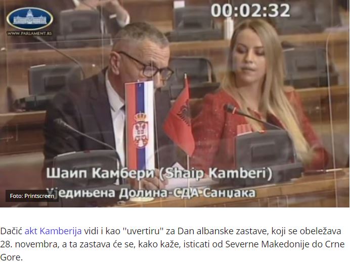 Ο Αλβανός βουλευτής του σερβικού Κοινοβουλίου Σαΐπ Καμπέρι ζήτησε την Πέμπτη αλλαγές στον Νόμο για τα Δικαιώματα και τις Ελευθερίες των Εθνικών Μειονοτήτων και συμβολικά έβαλε την αλβανική σημαία στον κοινοβουλευτικό έδρανο που καθόταν, αλλά με την επιμονή του προέδρου του κοινοβουλίου αναγκάστηκε να την αφαιρέσει.