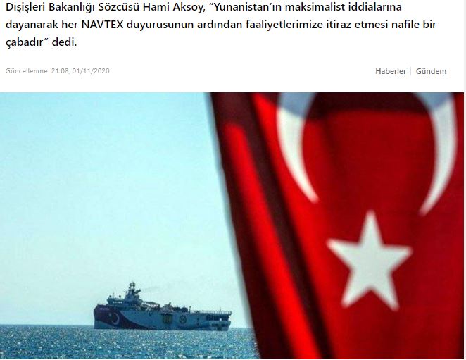 Είναι μια μάταιη προσπάθεια της Ελλάδας να αντιταχθεί στις δραστηριότητές μας μετά από κάθε ανακοίνωση NAVTEX που βασίζεται σε μαξιμαλιστικούς ισχυρισμούς. Η χώρα μας θα συνεχίσει τις δραστηριότητές της στην περιοχή στο πλαίσιο των δικαιωμάτων που απορρέουν από το διεθνές δίκαιο.