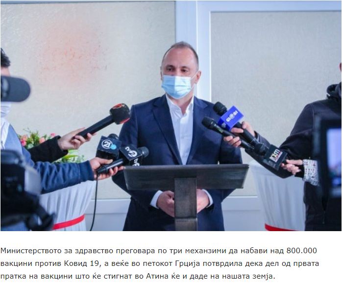 Χρησιμοποιούμε σχεδόν όλα τα μέσα, συμπεριλαμβανομένου του μηχανισμού COVAX που ήταν ο πρώτος διαθέσιμος σε εμάς και φυσικά μέσω αυτών των άμεσων συμφωνιών άλλων κρατών μελών της ΕΕ για την παροχή ορισμένης ποσότητας εμβολίων για εμάς», δήλωσε ο υπουργός Υγείας Βένκο Φιλίπτσε, στη χθεσινή παρουσία του στην Sitel TV.