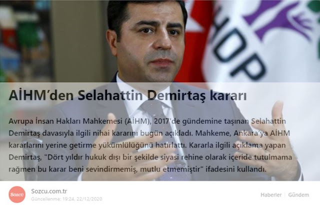 Όπως είναι γνωστό, σημειώνει το δημοσίευμα, το Ευρωπαϊκό Δικαστήριο Ανθρωπίνων Δικαιωμάτων στην πρώτη απόφασή του της 20ής Νοεμβρίου 2018, αποφάσισε ότι ο Ντερμιτάς θα πρέπει να απελευθερωθεί αμέσως, αλλά αυτή η απόφαση δεν εφαρμόστηκε μετά την παρέμβαση του Προέδρου Ερντογάν ότι «θα ενεργήσουμε αντίθετα με αυτήν, για να ολοκληρώσουμε τη δουλειά».