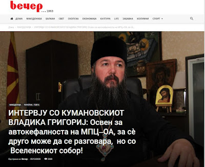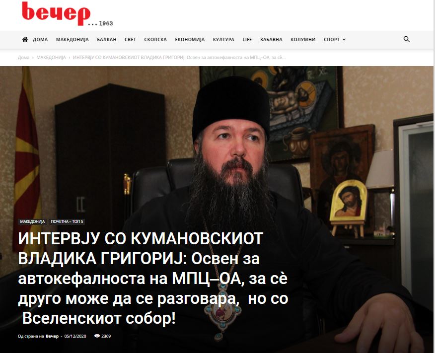 Στην πρώτη του εμφάνιση στα ΜΜΕ από τότε που έγινε επικεφαλής της επισκοπής Κουμάνοβου (χειροτονία και ενθρόνιση προ 6 μηνών περίπου, εις διαδοχήν του παραιτηθέντος προκατόχου του κ.Ιωσήφ) ο νέος Επίσκοπος Κουμάνοβου, της αυτοαποκαλούμενης "Μακεδονικής Εκκλησίας» κ. Γρηγόριος, έδωσε την πρώτη του συνέντευξη στην εφημερίδα των Σκοπίων ‘Βέτσερ’.