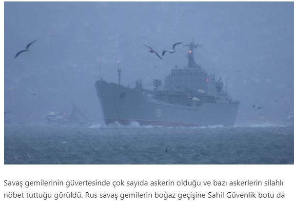 Το αποβατικό ‘Novocherkassk’ , που ανήκει στο Ναυτικό της Μαύρης Θάλασσας της Ρωσίας, με αριθμό 142 και το πολεμικό πλοίο με το όνομα Saratov με αριθμό πλοίου 150 εισήλθαν στο Βόσπορο το ένα μετά το άλλο από τη Θάλασσα του Μαρμαρά στις 08:00.