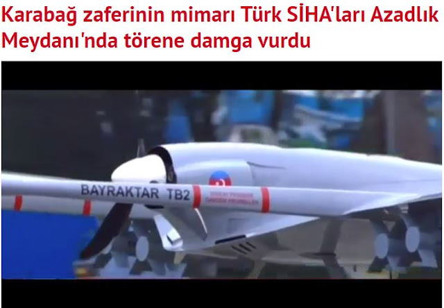 Τα τουρκικά εξοπλισμένα UAV που άλλαξαν την πορεία του πολέμου, παίζοντας σημαντικό ρόλο στη νίκη στο Καραμπάχ με αποτέλεσμα να εκδιωχθεί η εισβολέας Αρμενία, παρουσιάστηκαν στην παρέλαση της Νίκης στο Μπακού του Αζερμπαϊτζάν, γράφει η τουρκική Aksam.