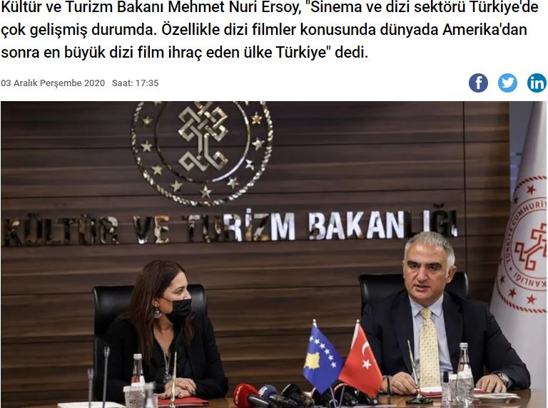 Ο υπουργός Πολιτισμού και Τουρισμού Μεχμέτ Νούρι Ερσόι δήλωσε ότι: «ο κινηματογράφος και η παραγωγή τηλεοπτικών σειρών είναι πολύ ανεπτυγμένες στην Τουρκία. Ειδικά με τα τουρκικά σήριαλ που μεταδίδονται στον κόσμο ερχόμαστε δεύτεροι μετά τις ΗΠΑ».