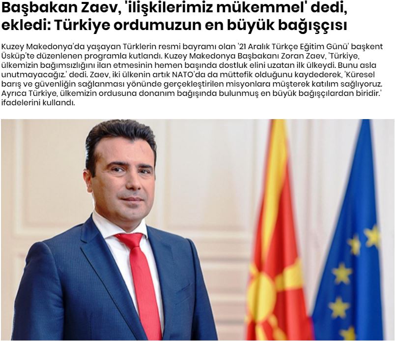 Ο πρωθυπουργός της Βόρειας Μακεδονίας Ζόραν Ζάεφ δήλωσε: «Η Τουρκία ήταν η πρώτη χώρα που έδωσε ένα χέρι φιλίας στην αρχή της διακήρυξης της ανεξαρτησίας της χώρας μας. Δεν θα το ξεχάσουμε ποτέ», είπε.