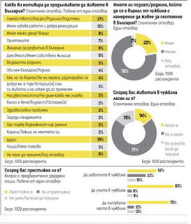 Η πλειοψηφία των Βουλγάρων συμμερίζεται την άποψη ότι είναι σπουδαίο να σπουδάσει (83%), να εργαστεί (52%) και να ζήσει (75%) στο εξωτερικό. Ενώ το 33% δεν βλέπει τίποτε σημαντικό στην εργασία στο εξωτερικό και το 12% δεν θα ήθελε να ζήσει εκτός Βουλγαρίας.