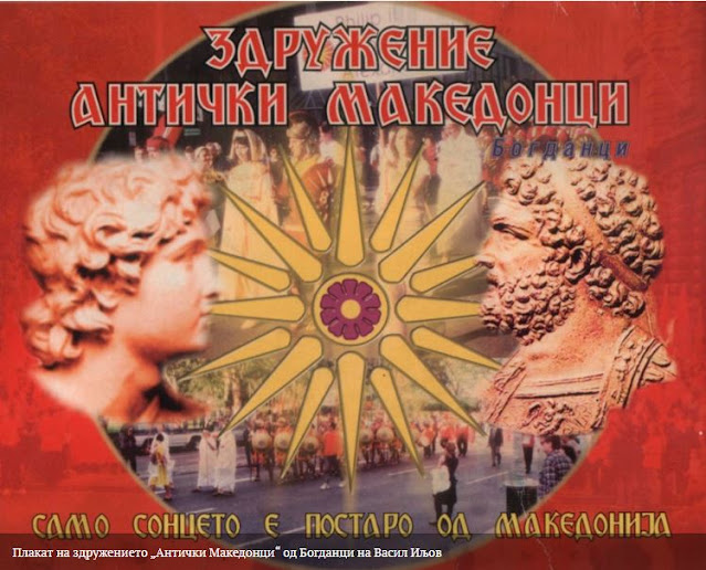 Αφίσα της ένωσης πολιτών «Αρχαίοι Μακεδόνες» από το Μπογκντάντσι. Η ένωση είναι ενάντια στην επίσημη ιστορική επιστήμη της Δημοκρατίας της Βόρειας Μακεδονίας και αγωνίζεται για την αναθεώρηση της ιστορίας για την άμεση σχέση του σύγχρονου κράτους με την αρχαιότητα.