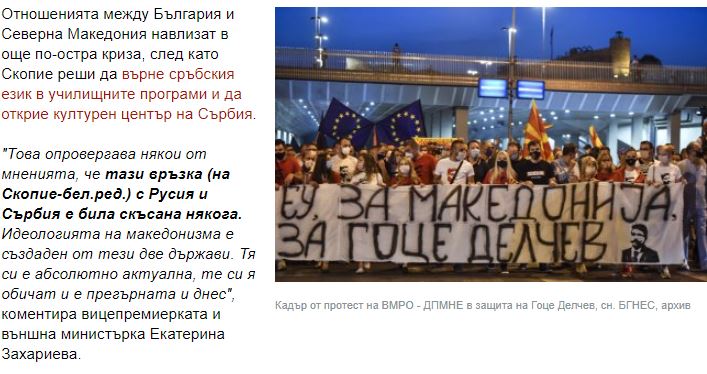 «Οι σχέσεις μεταξύ της Βουλγαρίας και της Βόρειας Μακεδονίας εισέρχονται σε μια ακόμη πιο οξεία κρίση αφού τα Σκόπια αποφάσισαν να εισαγάγουν πάλι τα Σέρβικα στα σχολικά προγράμματα και να ανοίξουν ένα πολιτιστικό κέντρο για τη Σερβία», γράφει βουλγαρικό δημοσίευμα.
