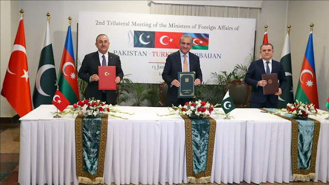 Ο υπουργός Εξωτερικών της Τουρκίας Μεβλούτ Τσαβούσογλου μαζί με τους υπουργούς Εξωτερικών του Πακιστάν και του Αζερμπαϊτζάν σε κοινή συνέντευξη Τύπου μετά την Τριμερή Συνάντηση, δηλώνοντας ότι έχουν αποφασίσει να αναπτύξουν τις σχέσεις σε πολλούς τομείς «αποφασίσαμε να λάβουμε σημαντικά μέτρα για τη βελτίωση της σταθερότητας και της ευημερίας», όπως είπε.