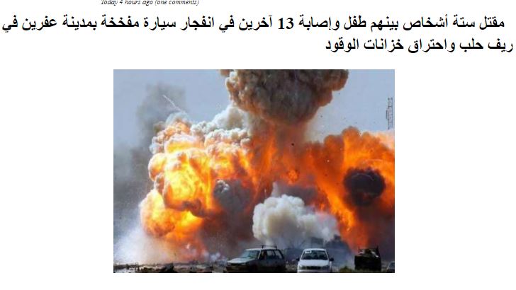 Έξι άνθρωποι, μεταξύ αυτών και ένα παιδί σκοτώθηκαν και 13 άλλοι τραυματίστηκαν σε έκρηξη βόμβας αυτοκινήτου στο Αφρίν στη βόρειο Συρία, το οποίο βρίσκεται υπό τουρκική κατοχή από τα μέσα Μαρτίου του 2018.