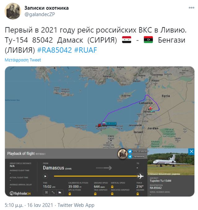 «Η πρώτη πτήση των Ρωσικών Αεροδιαστημικών Δυνάμεων προς τη Λιβύη το 2021.Tu 154 85042 από τη Δαμασκό στη Βεγγάζη» όπως σημειώνει Ρώσος παρατηρητής πτήσεων στο Twitter.