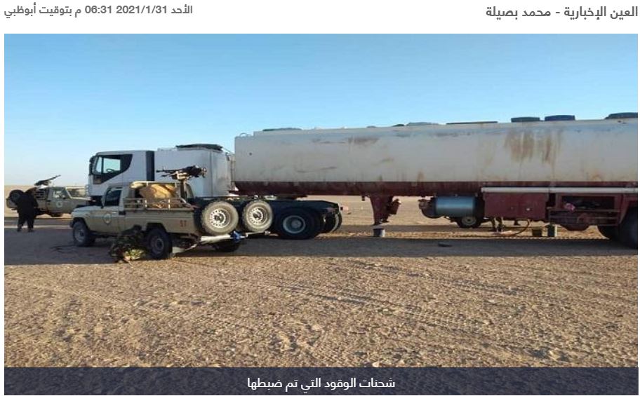 Η ταξιαρχία «Subul al-Salam» της Γενικής Διοίκησης του Λιβυκού Στρατού ανακοίνωσε ότι κατάφερε να σταματήσει και να κατασχέσει 4 φορτηγά με καύσιμα που εισήχθησαν λαθραία στο Τσαντ.