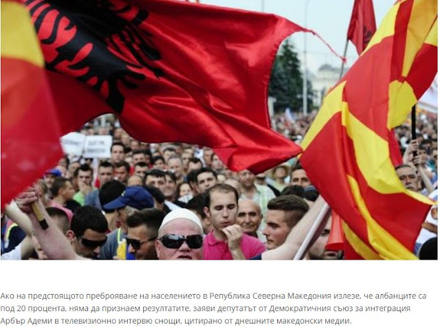 Ο βουλευτής της «Δημοκρατικής Ένωσης για Ενσωμάτωση- DUI», Άρμπορ Αντέμι σε τηλεοπτική εκπομπή χθες το βράδυ ανέφερε ότι «εάν η απογραφή στη Δημοκρατία της Βόρειας Μακεδονίας δείξει ότι οι Αλβανοί είναι του 20 τοις εκατό, δεν θα αναγνωρίσουμε τα αποτελέσματα».