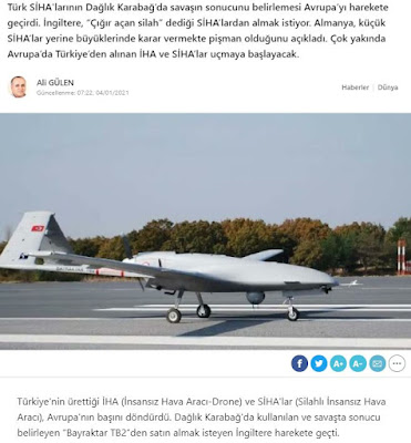 Η Τουρκία που παράγει Μη επανδρωμένα εναέρια οχήματα παρακολούθησης καθώς και Οπλισμένα Μη επανδρωμένα εναέρια οχήματα έγινε ο επικεφαλής της Ευρώπης, όπως σημειώνει χαρακτηριστικά το δημοσίευμα.